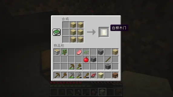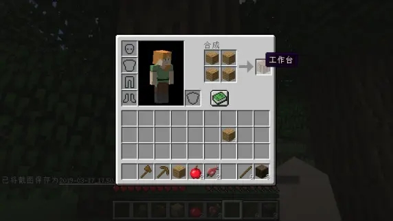我们打开背包,使用合成栏合成一个工作台,它可以帮助我们合成一系列的工具与更多方块物品。