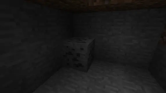 现在,我们需要开采一些煤矿来获取煤—它可以为我们制作火把或者是提供燃料。煤矿看起来黑黑的,所以非常好认,开采一个煤矿可以获取多个煤。