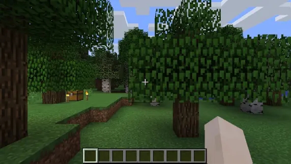 如果你启用了奖励箱选项,那么你在进入世界之后应该可以找到一个插着四只火把的箱子,里面包括一点食物与基本工具,这些都可以让你在新世界存活变得容易许多!