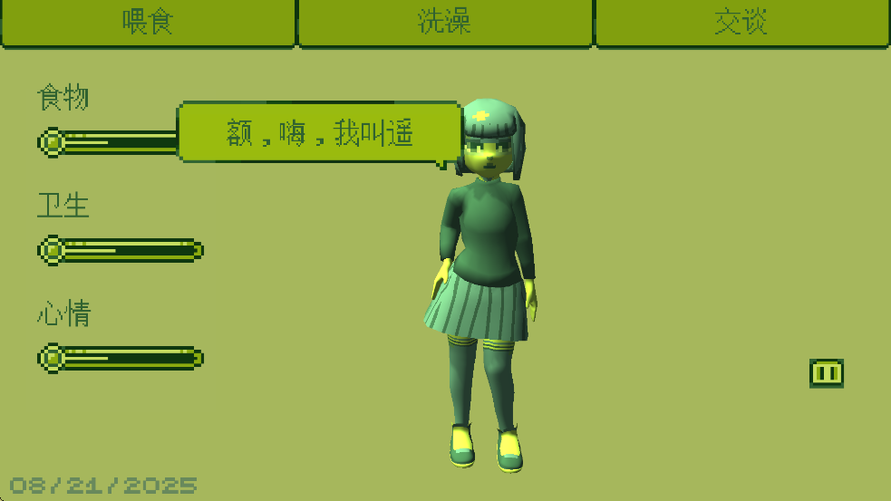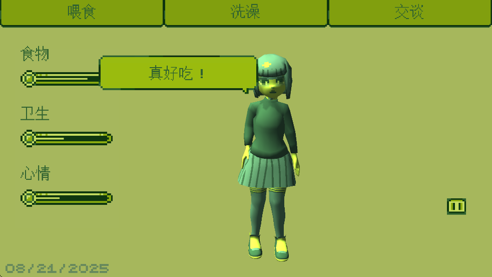 这不是一场单向照顾,而是一场双向奔赴的情感实验。你需要持续关注并平衡她的三大核心属性——饱食度(决定生存基础)、卫生值(影响健康与亲密度)、心情值(驱动剧情解锁与关系深化)。任一属性长期失衡都将引发连锁反应,甚至导向不可逆的结局分支。